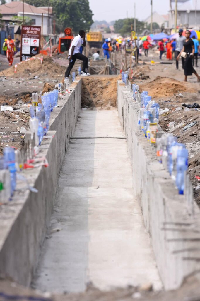 Les nouvelles voiries adopteront un profil en « toit inversé » en forme de V, permettant une canalisation efficace des eaux de pluie vers un drain central couvert. Ce système vise à réduire durablement les inondations récurrentes dans cette zone. Les chaussées seront réalisées en béton de ciment, tandis que les trottoirs seront pavés avec des matériaux recyclés à base de plastique, produits localement et certifiés résistants.